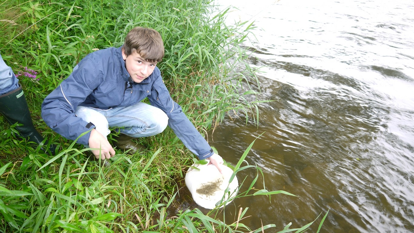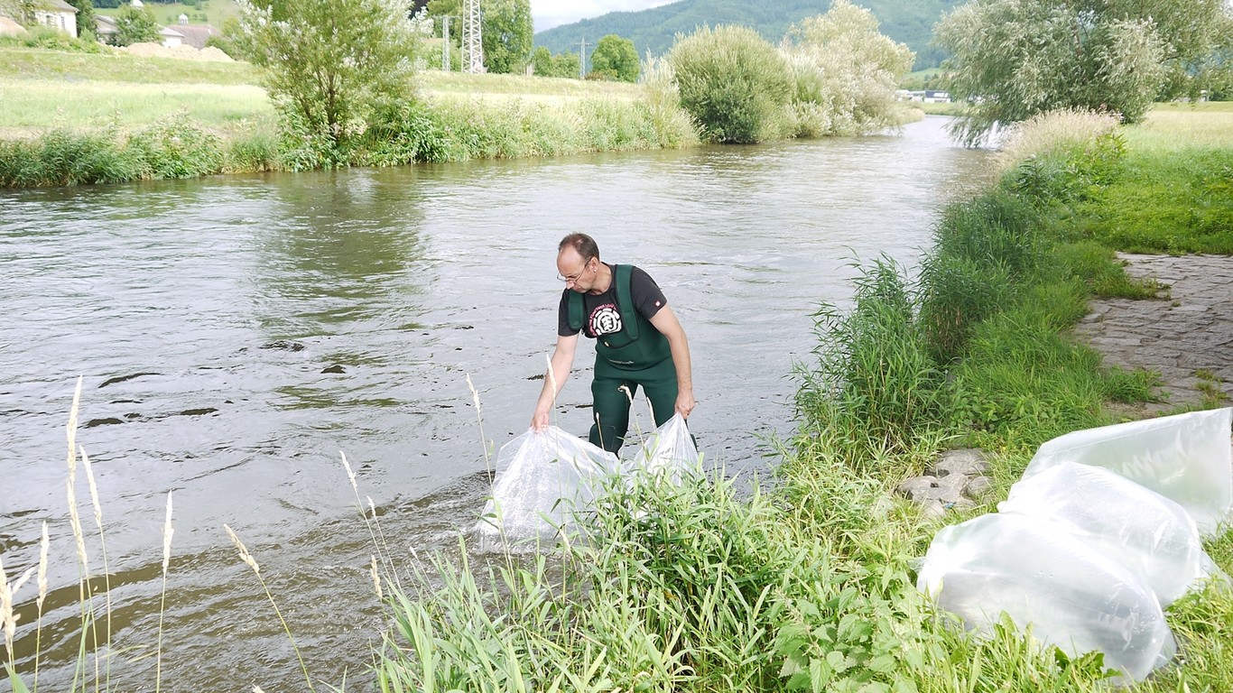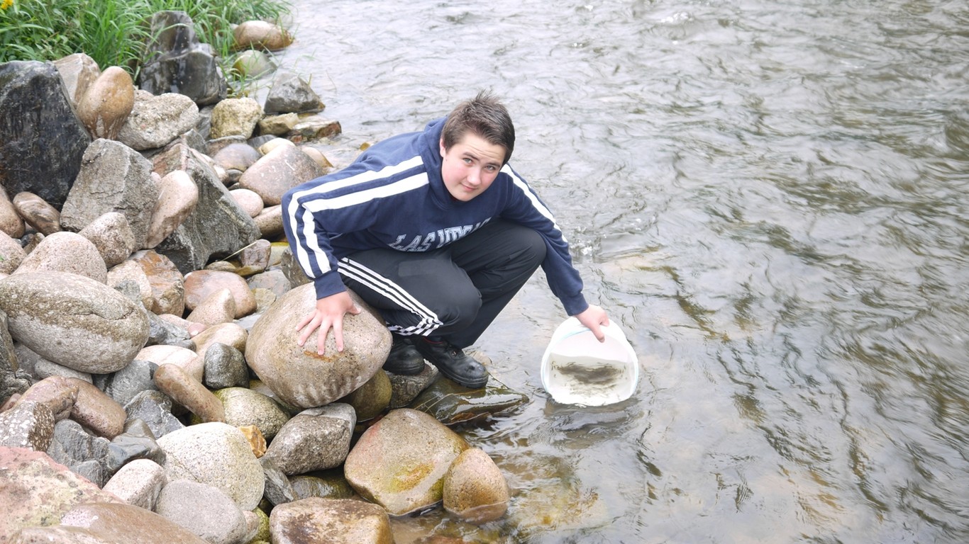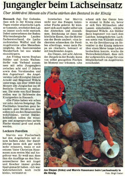 Kinzig 2012: Lachsbesatz durch die Angeljugend mit Lachsen der Lachszuchtstation Wolftal